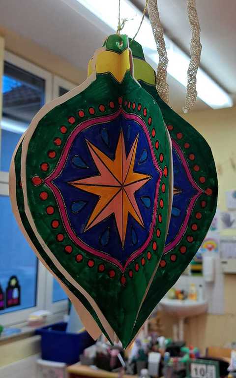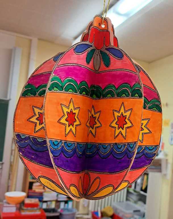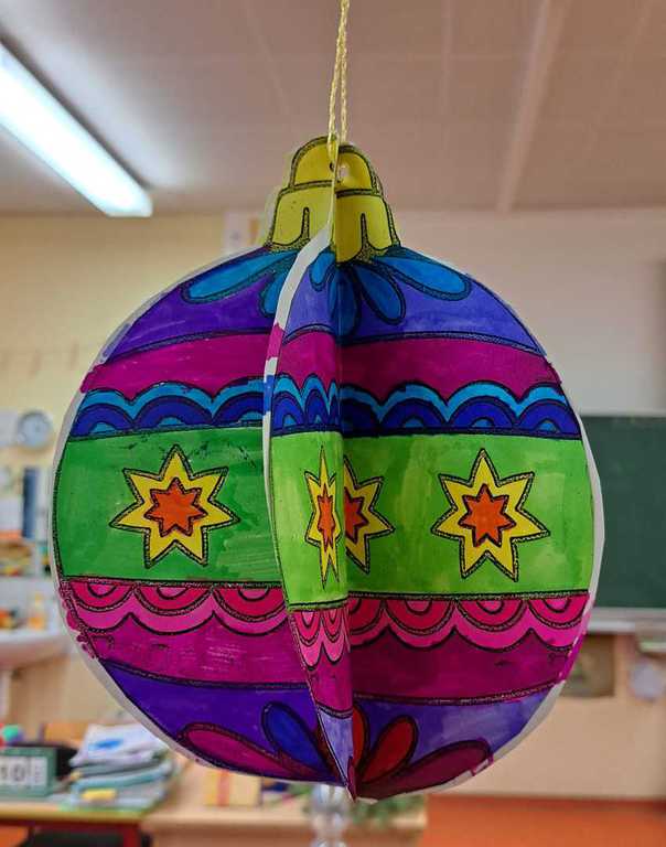 Eine beeindruckende Sammlung bunter, schillernder Weihnachtskugeln bringt den Klassenraum zum Funkeln.