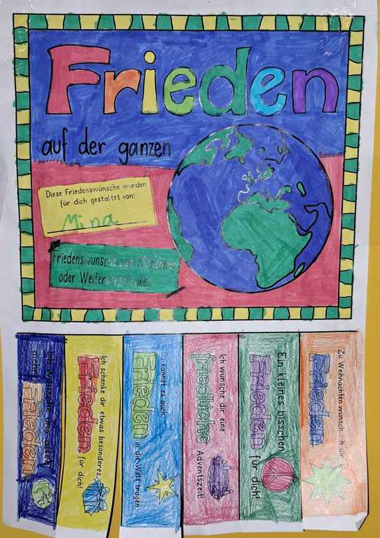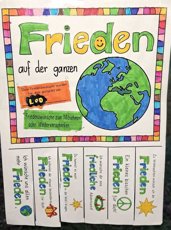Bunte Streifen mit Friedenswünschen hängen zum Abreißen und Mitnehmen bereit. Wir empfehlen: Einen Streifen abreißen, mitnehmen & verschenken. Wir hoffen auf eine friedliche Weihnachtszeit.