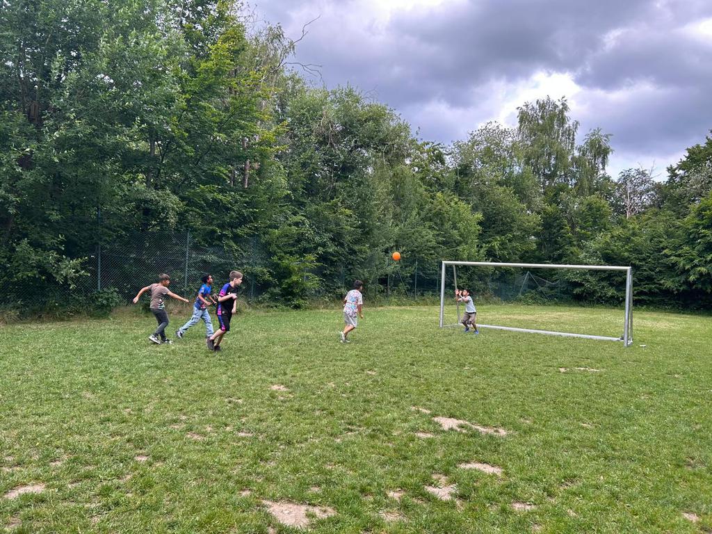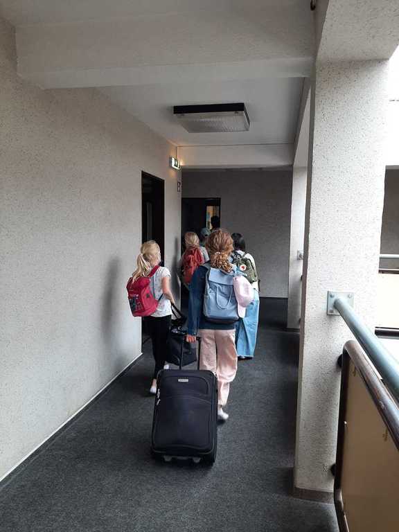 Nein, wir haben uns nicht verlaufen! Bis wir an der Eingangstür angekommen sind, sind wir schon an einem Spielplatz, einen Fußballplatz und einer Wiese mit einem kleinen Stall vorbeigekommen. Wer da wohl wohnt? Auf jeden Fall ist es hier toll! Uns unsere Koffer sind auch schon da!