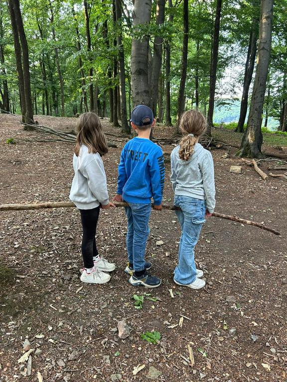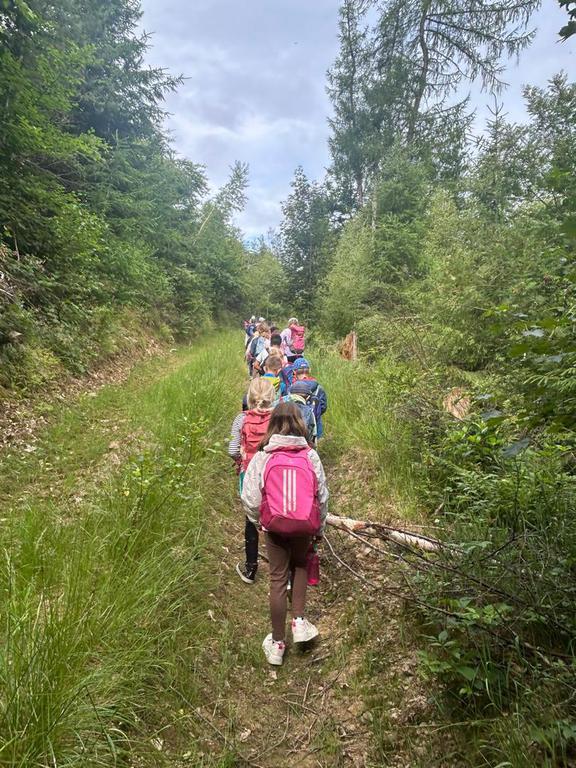 Endlich! Heute beginnt die Klassenfahrt zum Ahorn. Gemeinsam mit der 3a werden wir mit einem Bus zum "Lahmen Hasen" gebracht. Das ist in Hohenlimburg in der Obernahmer. Von dort geht es zu Fuß weiter. Zum Glück sind die Eltern so lieb und bringen das Gepäck mit dem Auto direkt zu unserem Ziel.